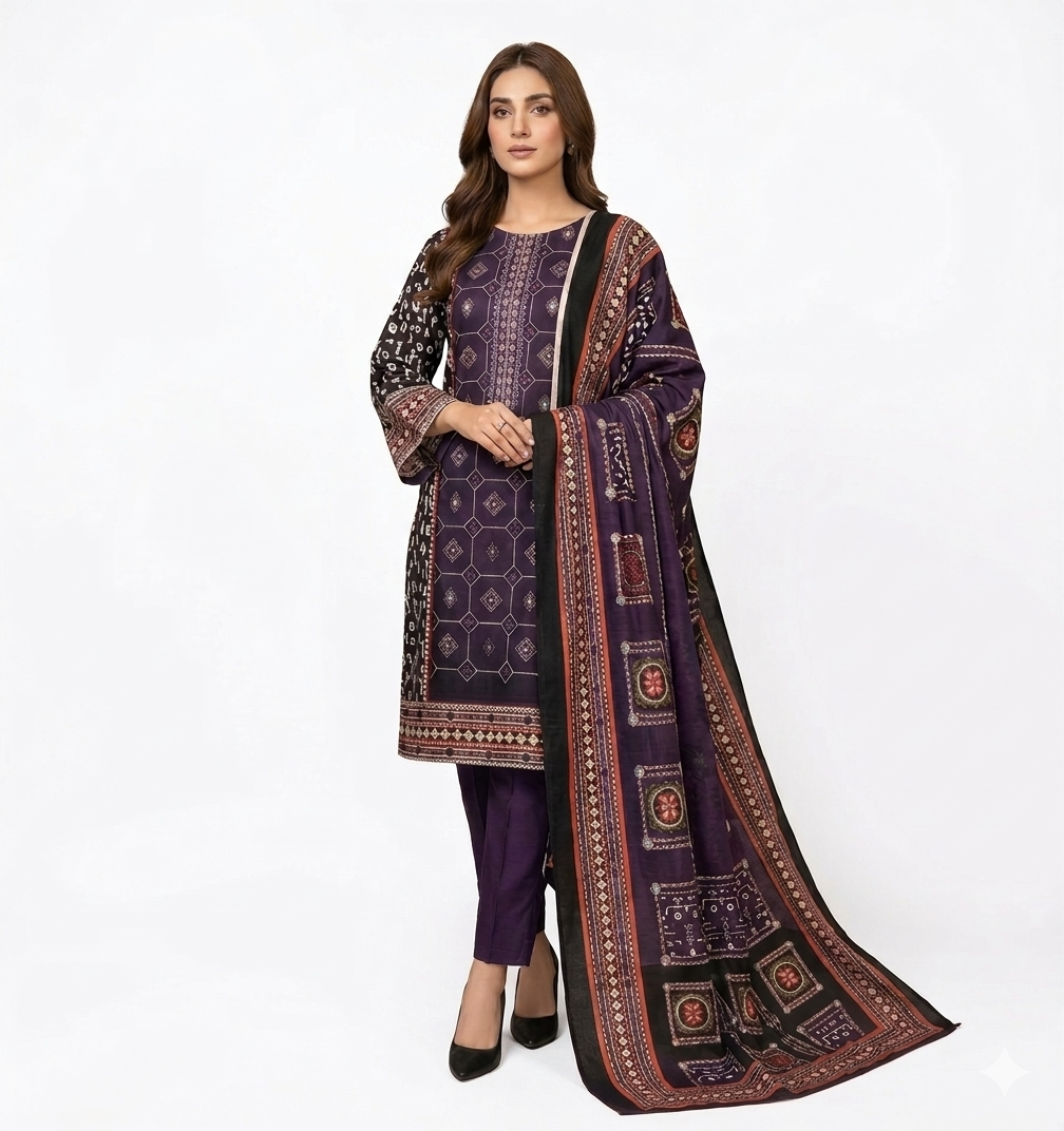 Experience elegance with the Haya Luxe Unstitched Lawn Collection by Noor e Azal. Ye suit khas taur par un khawateen ke liye design kiya gaya hai jo simplicity aur sophistication ka imtiaz chahti hain. Iska deep purple base aur intricate geometric patterns ise ek modern yet traditional look dete hain.