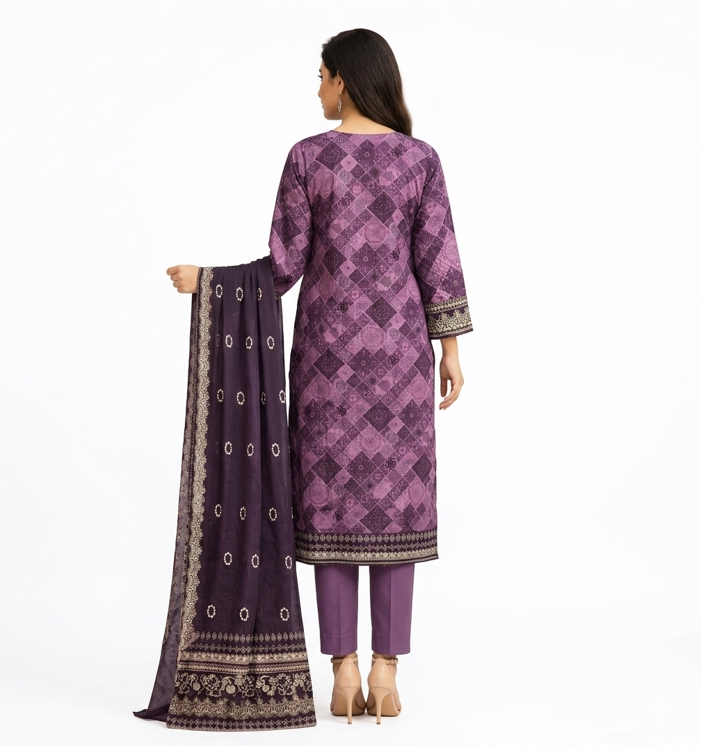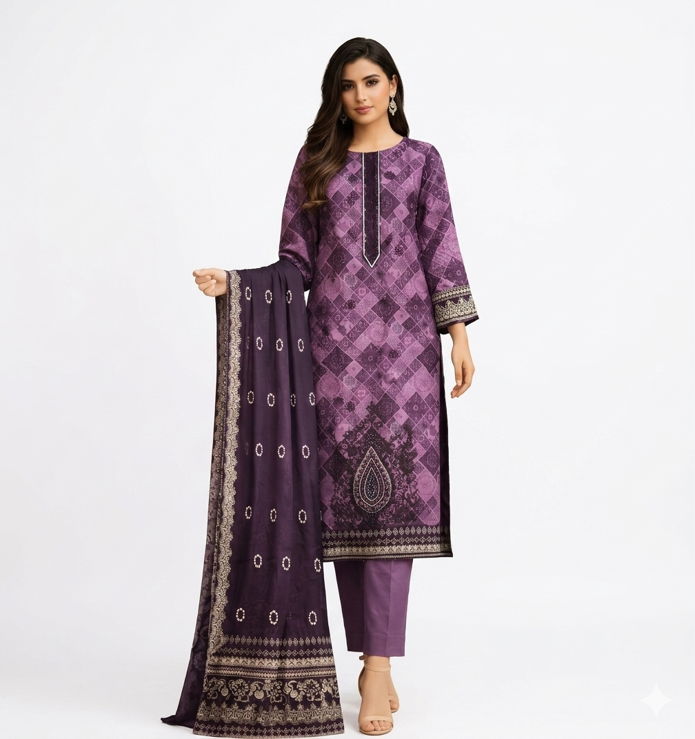 Experience the epitome of grace with Noor-e-Azal’s latest printed lawn masterpiece. This deep purple suit is designed for the modern woman who appreciates traditional aesthetics with a contemporary touch.